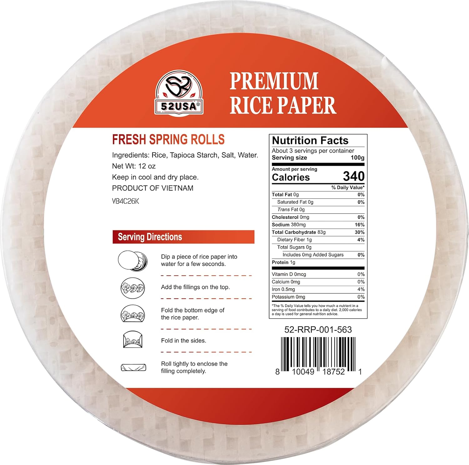 - 【NATURAL INGREDIENTS】: 52USA Spring Roll Rice Paper Wrappers are made with only four, all-natural ingredients: Rice, Tapioca Starch, Water & Salt. NO preservatives, NO additives. NO Added Color, Gluten-Free, 100% Natural, Vegan Friendly, Authentic Vietnamese Taste!